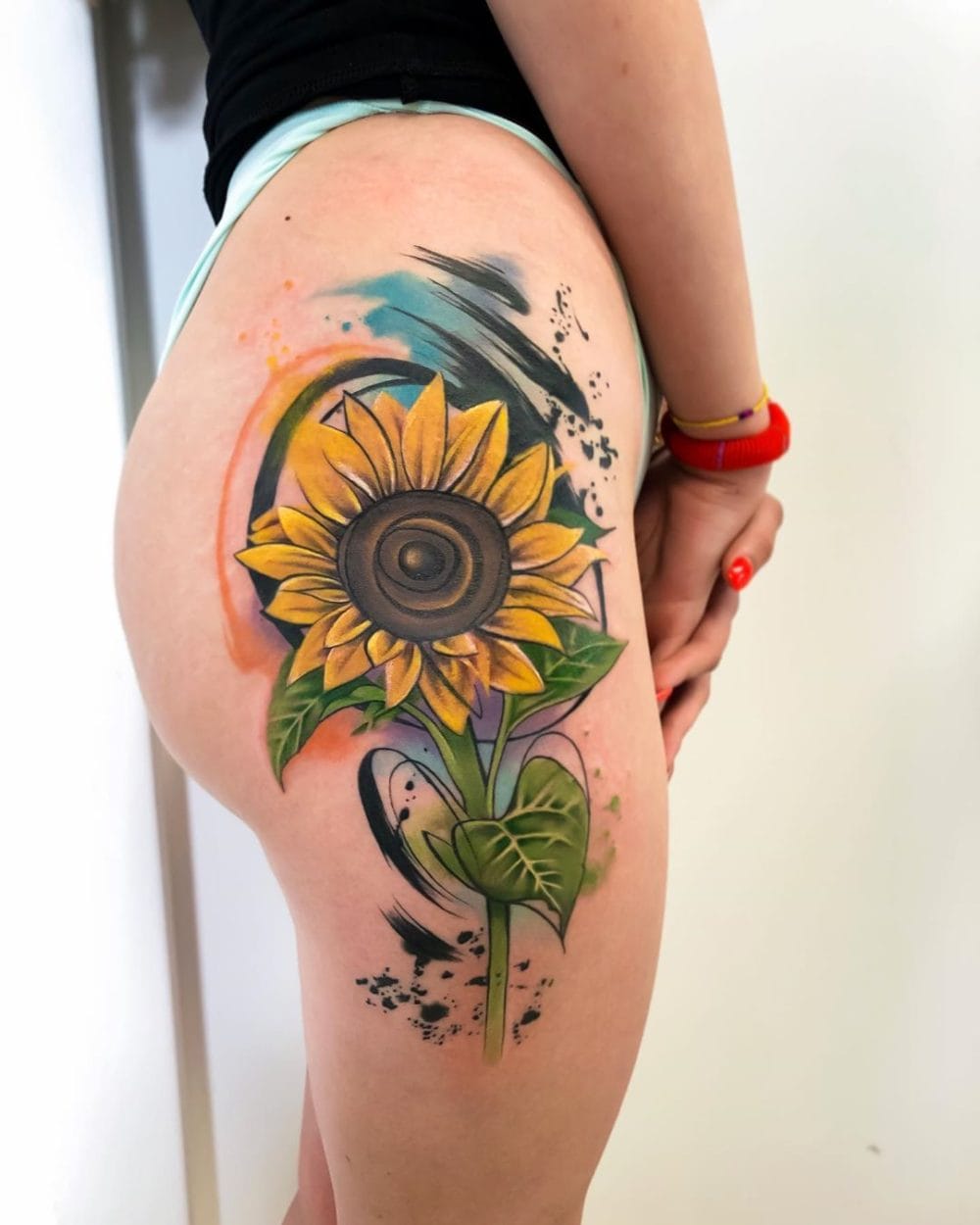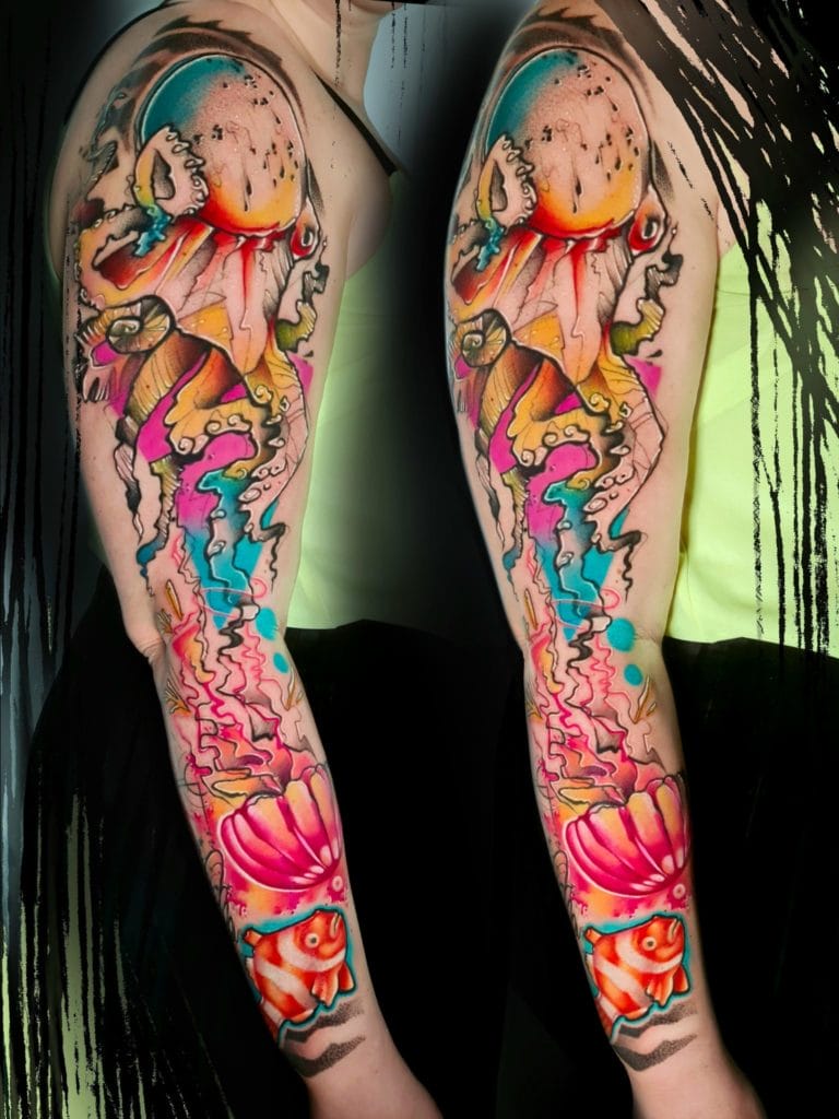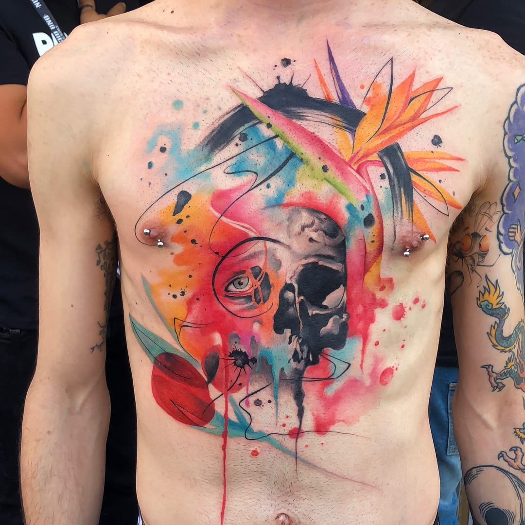 Además, el tatuaje tipo acuarela permite jugar con la piel como si fuera un lienzo. Se pueden crear efectos de difuminado, goteo, transparencia y mezcla de colores que no son habituales en otros estilos. El resultado es un tatuaje vivo, lleno de matices, imposible de replicar exactamente igual.