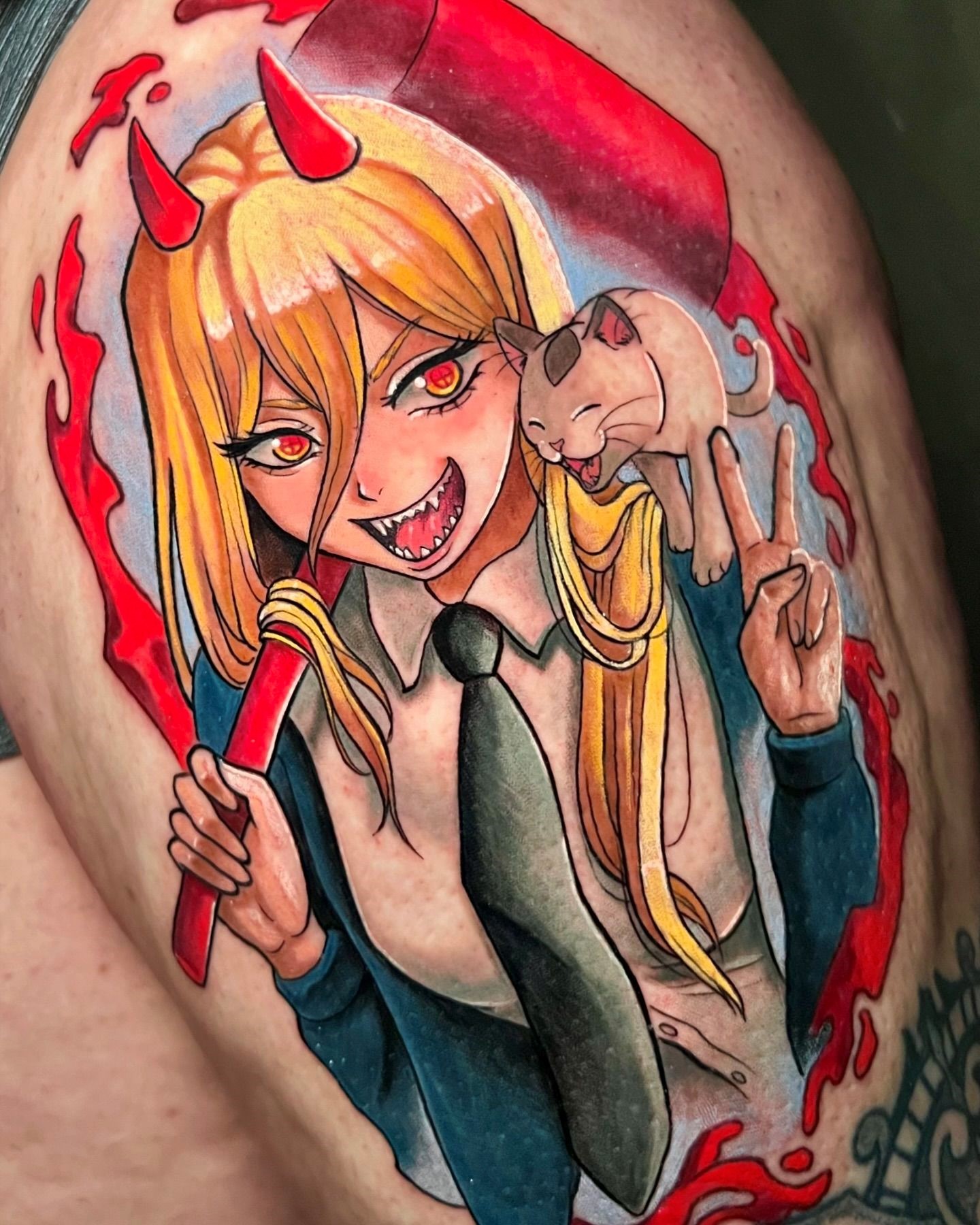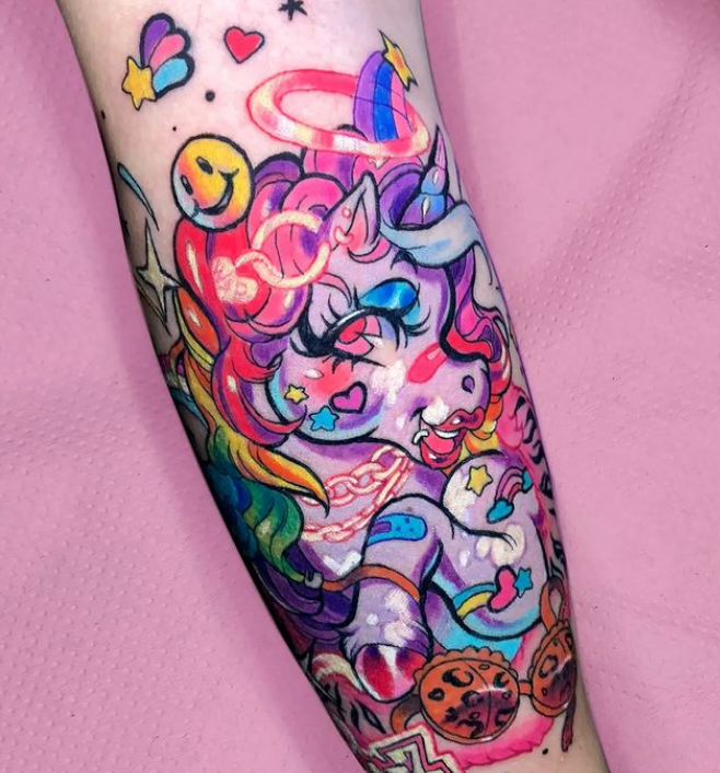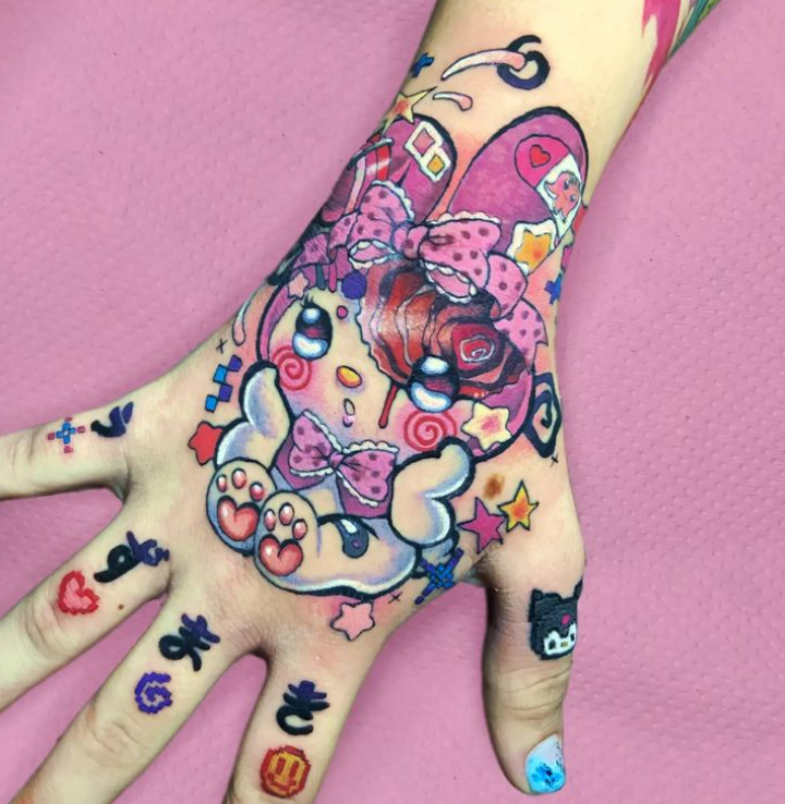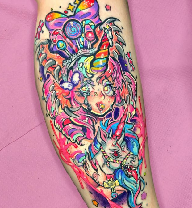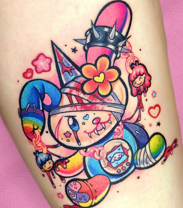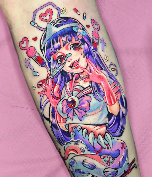 Hola, mi nombre es Meredith! En Instagram soy @patt_fry_tattoo y me encanta hacer tatus coloridos con temática anime, kawaii, gore.